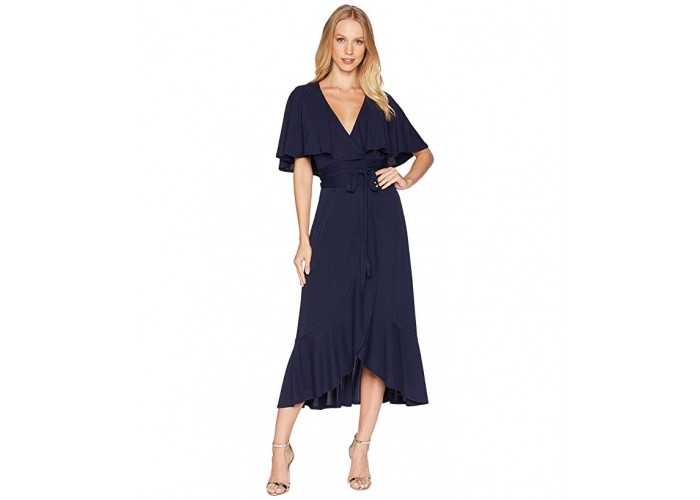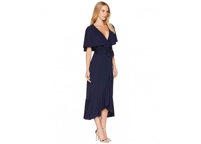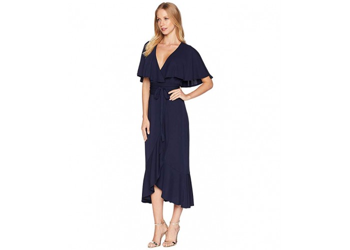 Женское удлиненное платье из трикотажной ткани под стрейч от популярной марки Bebe. Длина миди, на тонком ремне, с запахом.